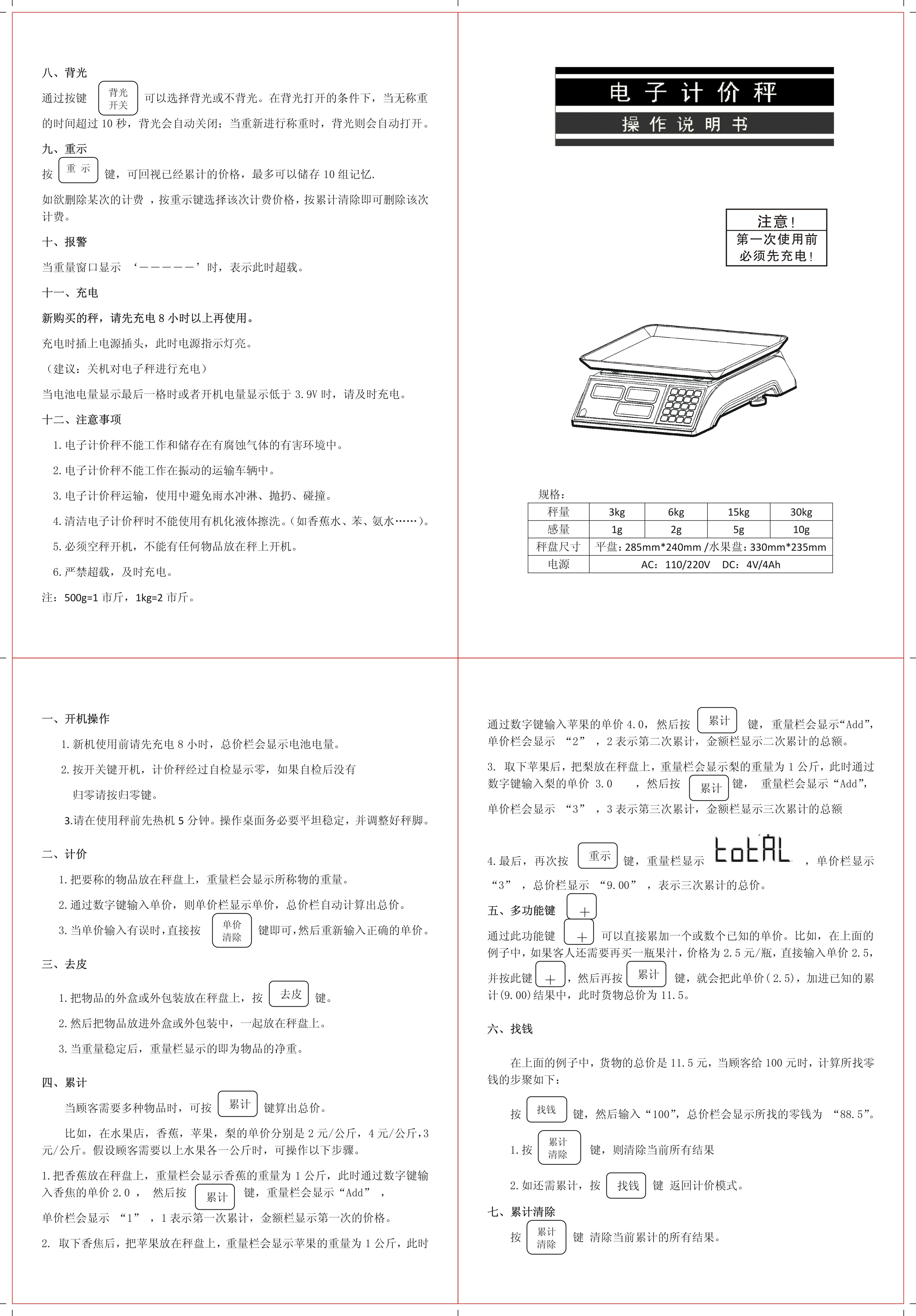 | 功能 | 自動(dòng)計(jì)價(jià),歸零,去皮,累計(jì),找錢(qián),記憶,單價(jià)設(shè)定,電量警示等功能 | |||||